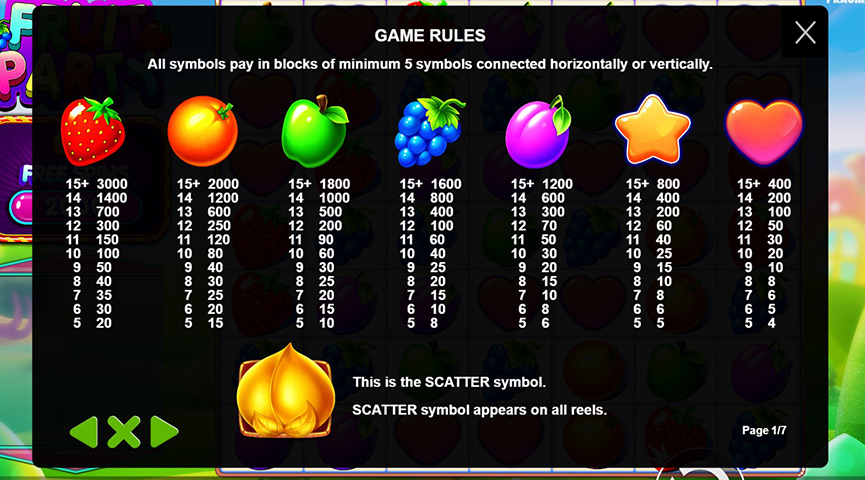 Hajde da počnemo sa nekim osnovnim pravilima i karakteristika ove igre. Pre svega, tematika je fokusirana na voće kao što je to slučaj u mnogim drugim preporučenim slot igrama. Međutim, kao dodatni simbol se pojavljuje i srce koje takođe ima određenu vrednost. Ukupan broj kolona koju ova igra ima je 7. Ono što je interesantno, ne postoje tipične linije za isplatu, već ova igra ima Cluster isplate. To znači da svi spojeni simboli nakon dobitka nestaju, a njih zamenjiju drugi.